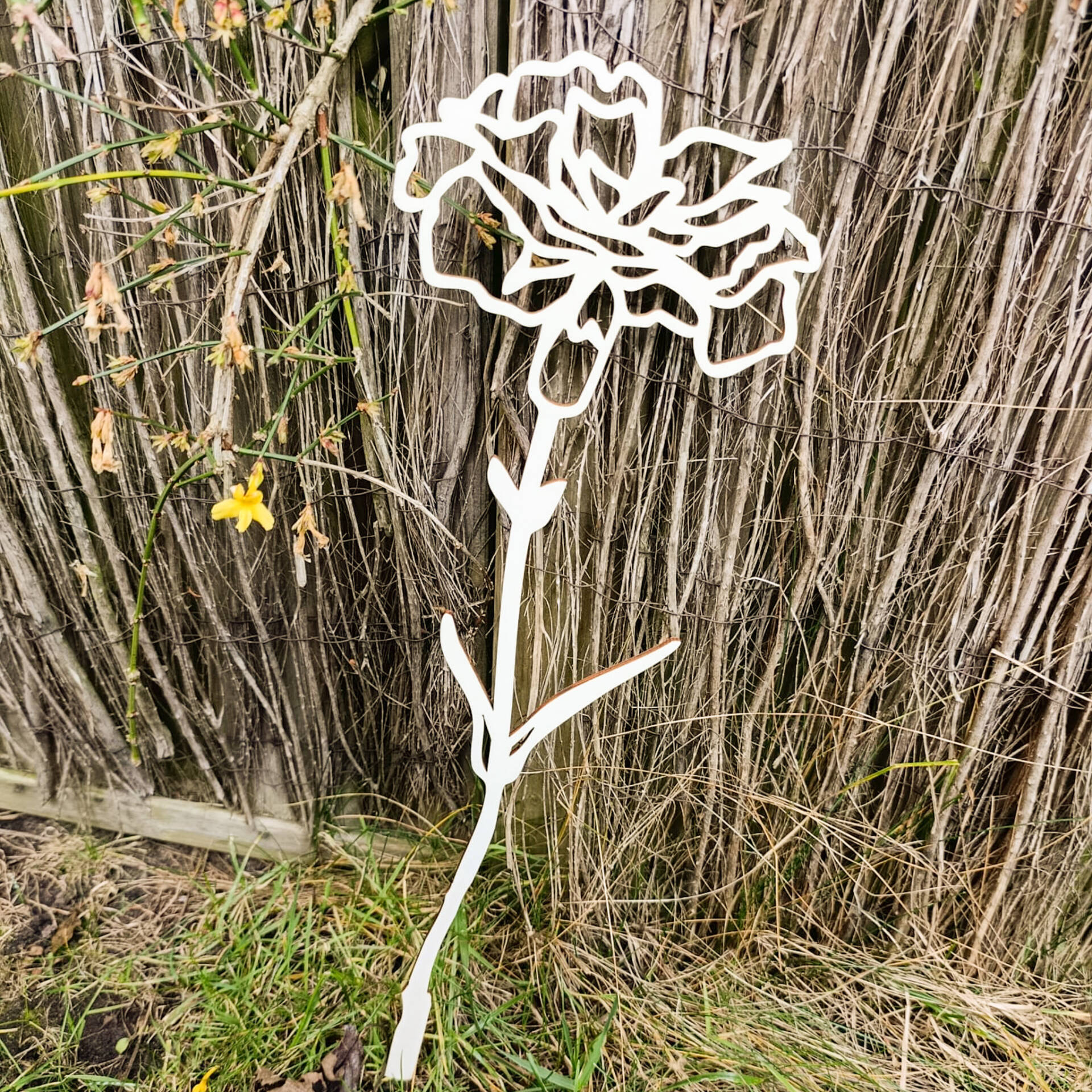 De naam wordt strak verwerkt in de steel van de bloem, wat zorgt voor een uniek en persoonlijk detail. Doordat elke bloem met de hand wordt gemaakt in onze skuur, is geen enkel exemplaar precies hetzelfde.
