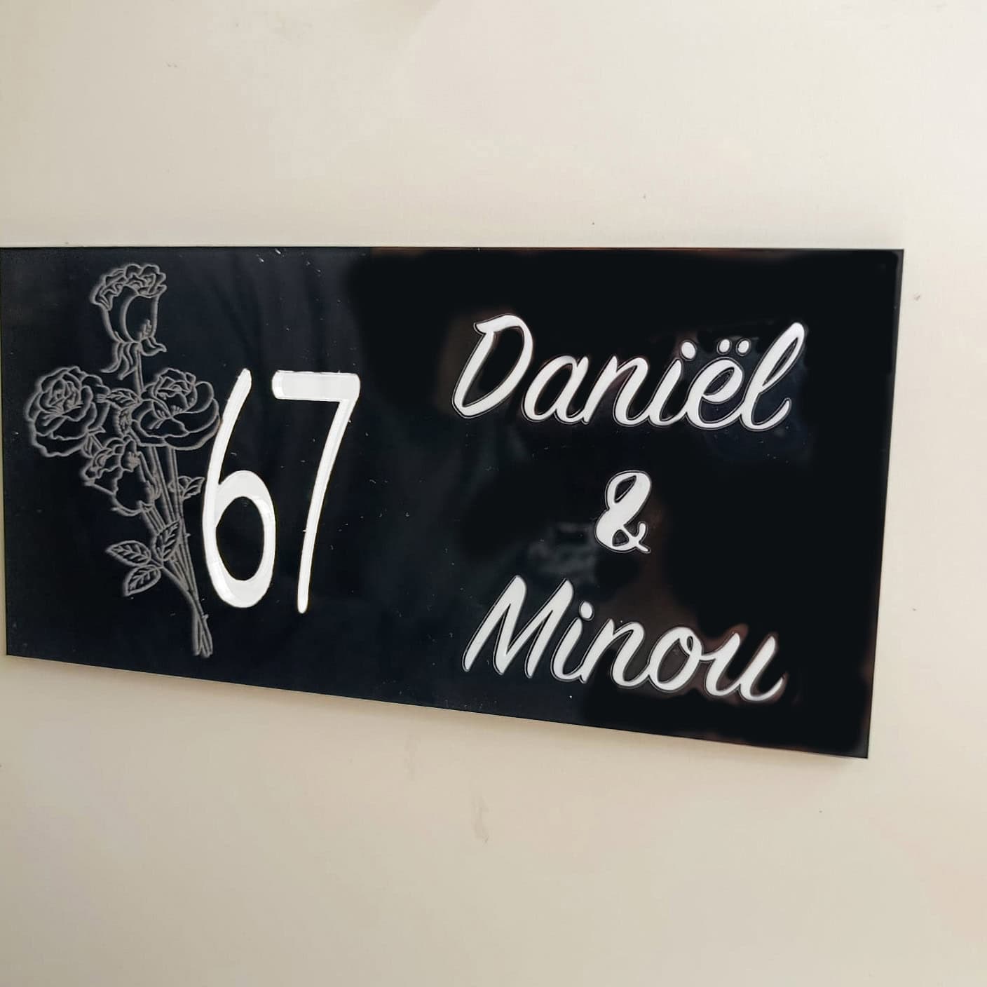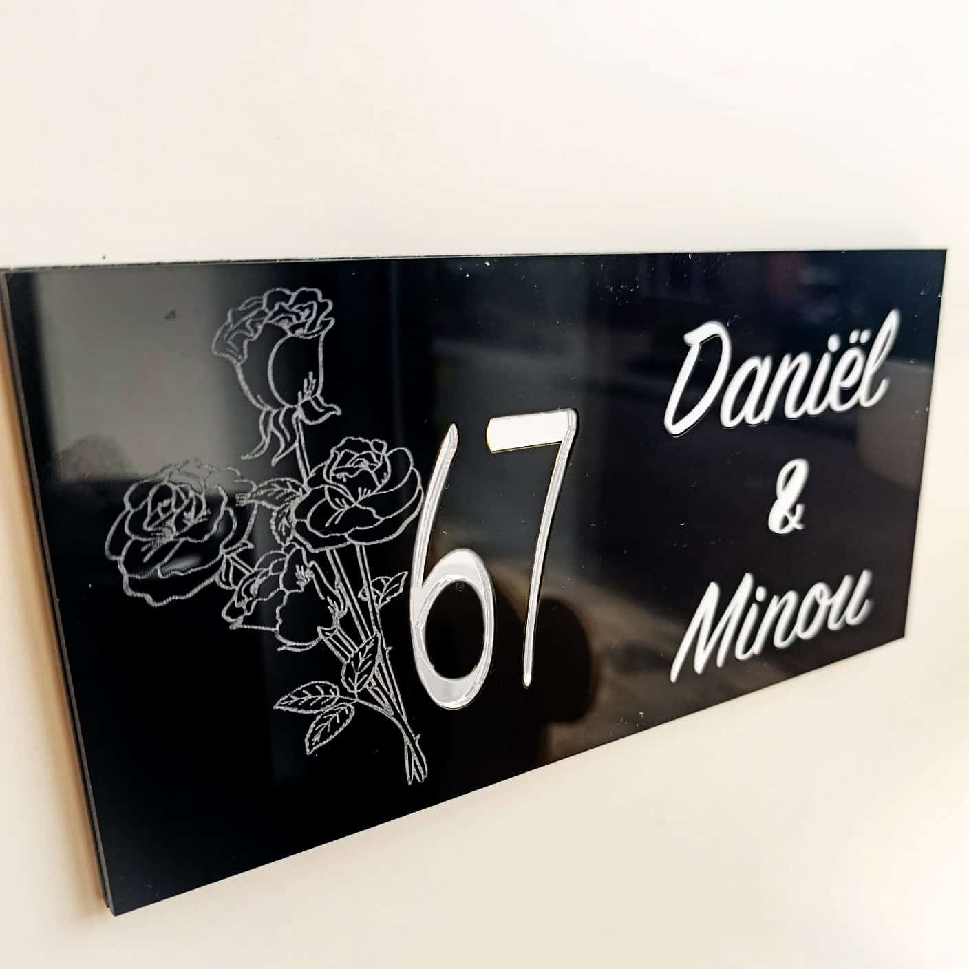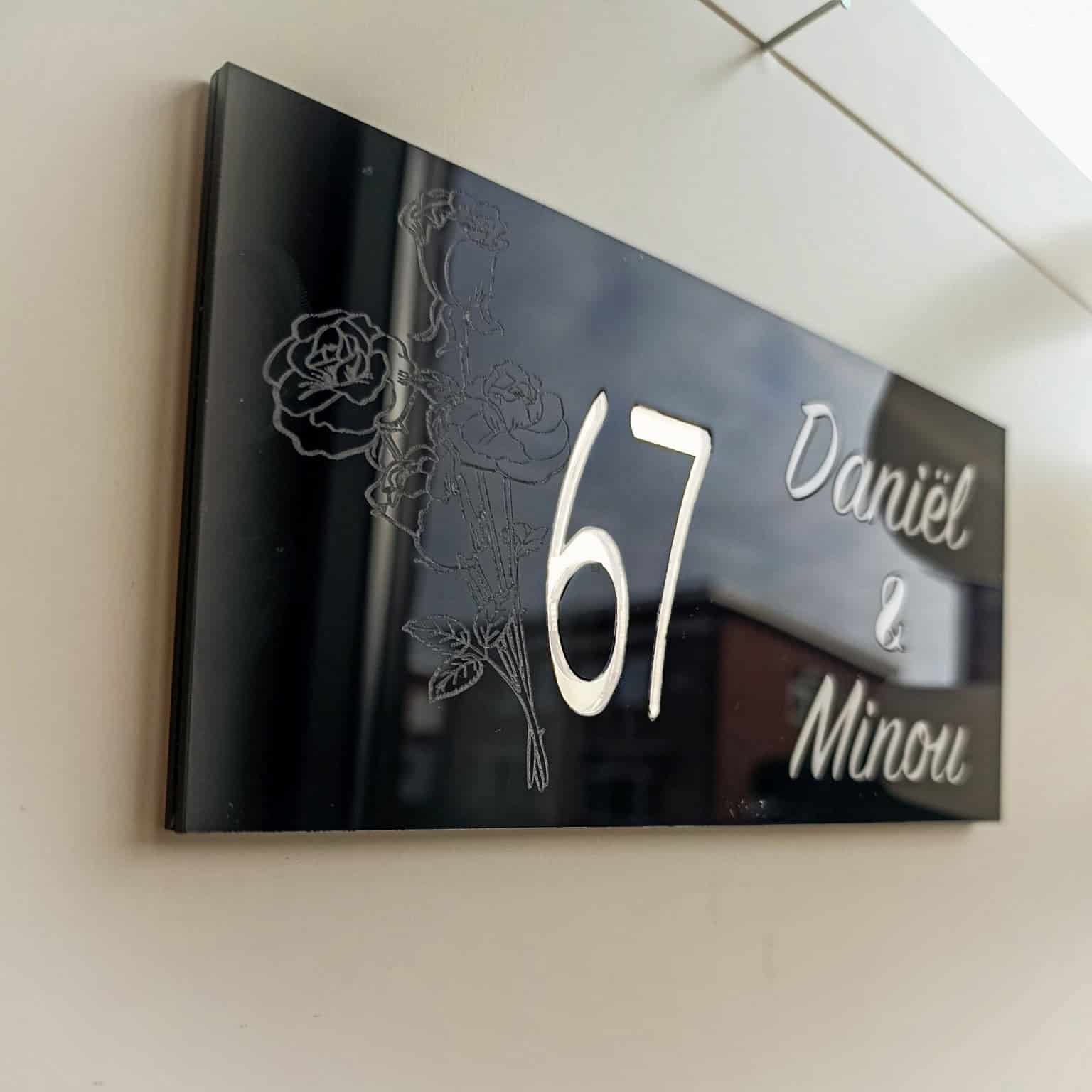 Het bordje is gemaakt van hoogwaardig zwart acrylaat, een stevig en weerbestendig materiaal dat jarenlang mooi blijft. Het huisnummer en de namen worden uitgevoerd in wit, wat zorgt voor een prachtig contrast en uitstekende leesbaarheid. De roos is professioneel in het oppervlak gegraveerd en blijft daardoor duurzaam zichtbaar zonder te vervagen.