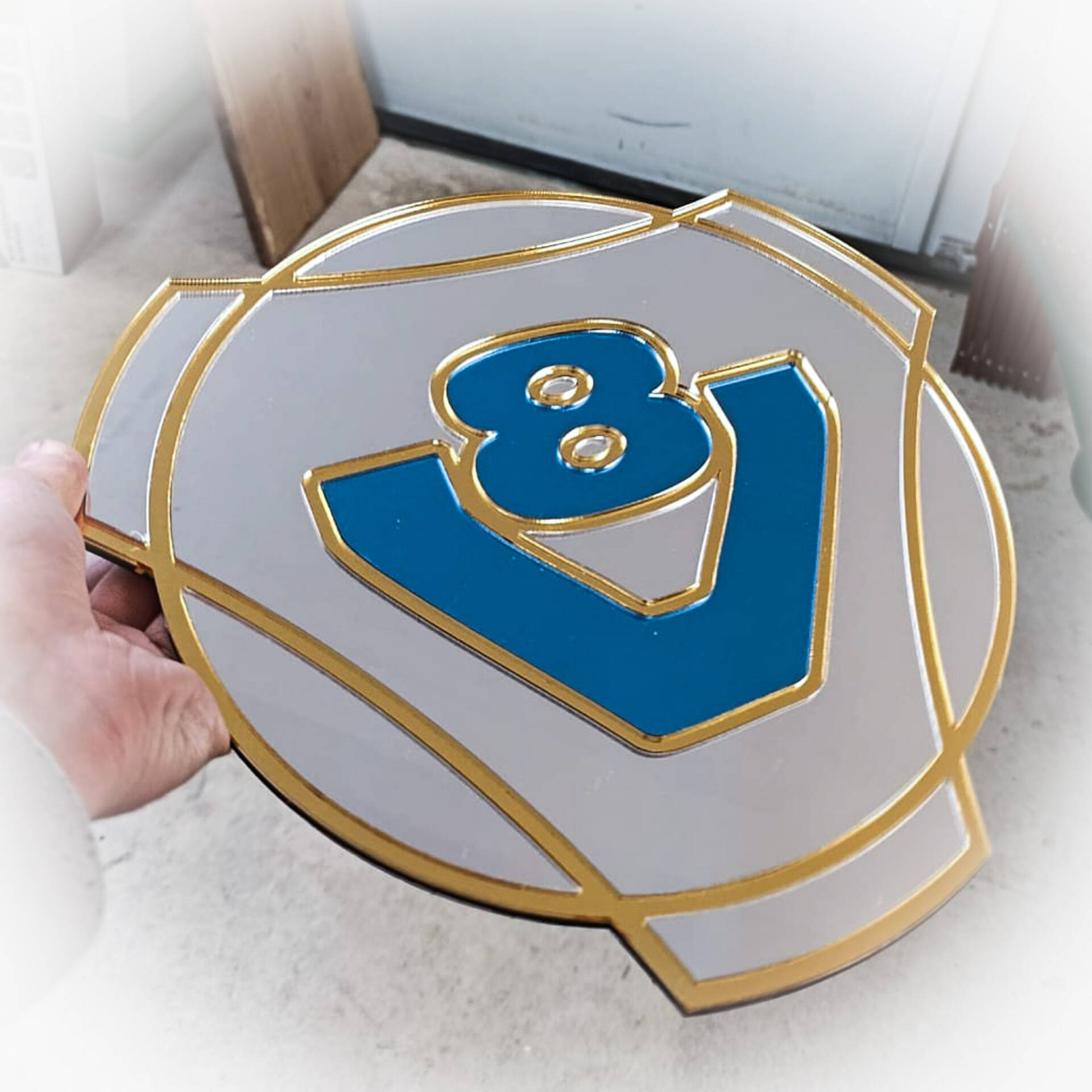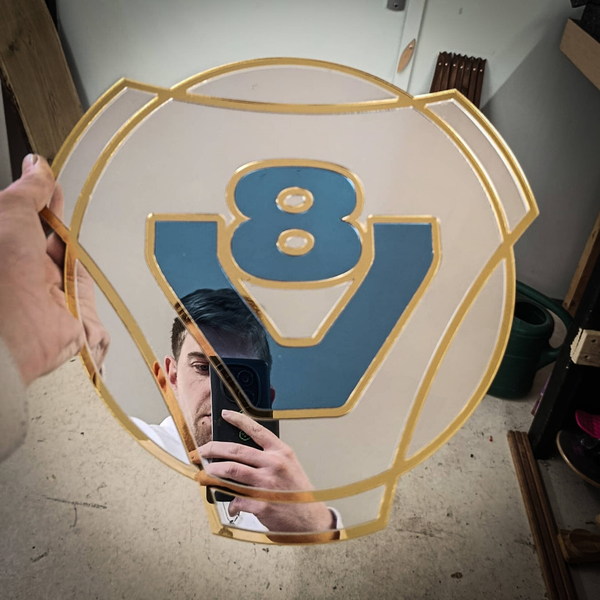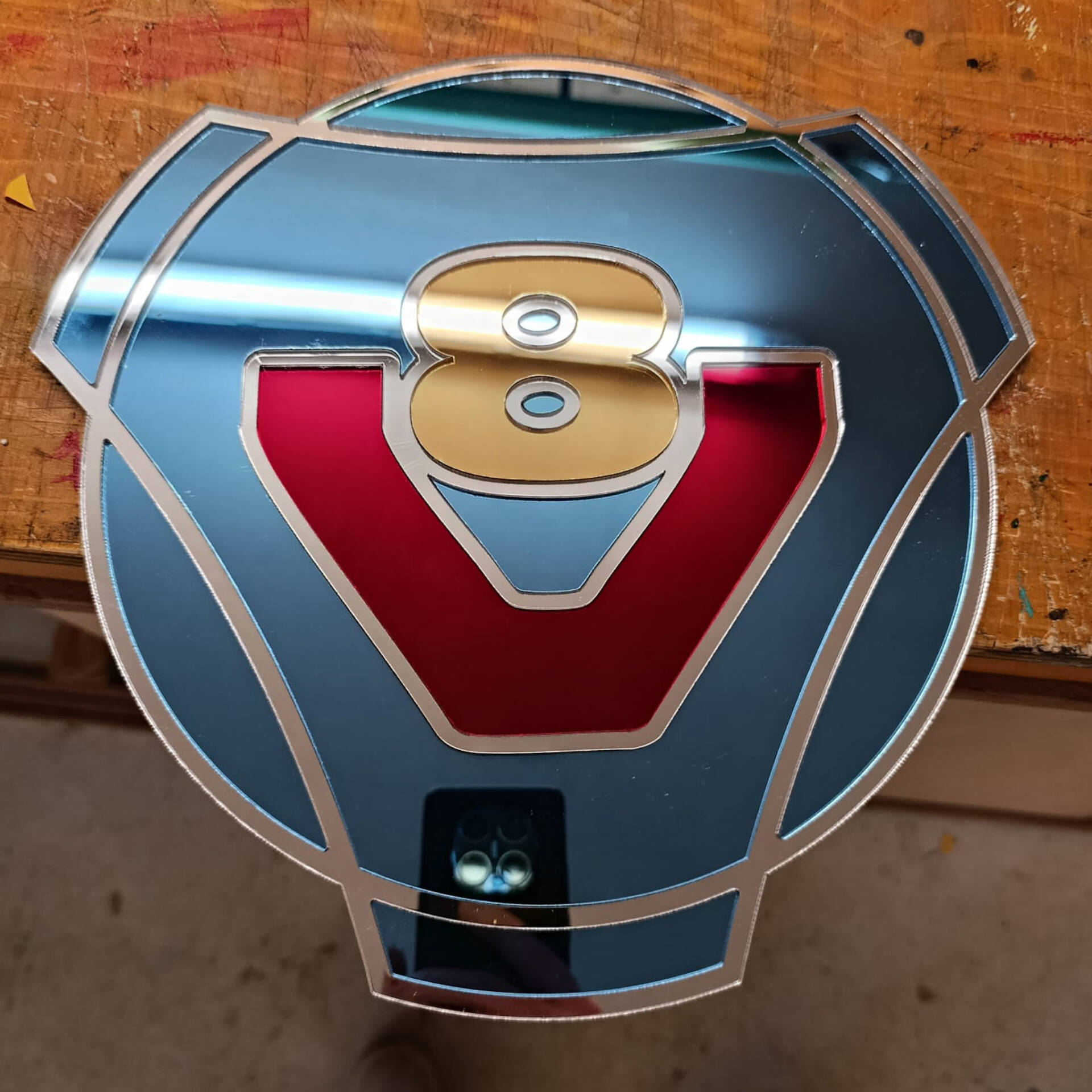 Het ontwerp van deze spiegel is gebaseerd op het bekende V8-logo, dat symbool staat voor kracht, prestaties en vakmanschap. De strakke lijnen en kleuren zorgen voor een moderne en industriële uitstraling.