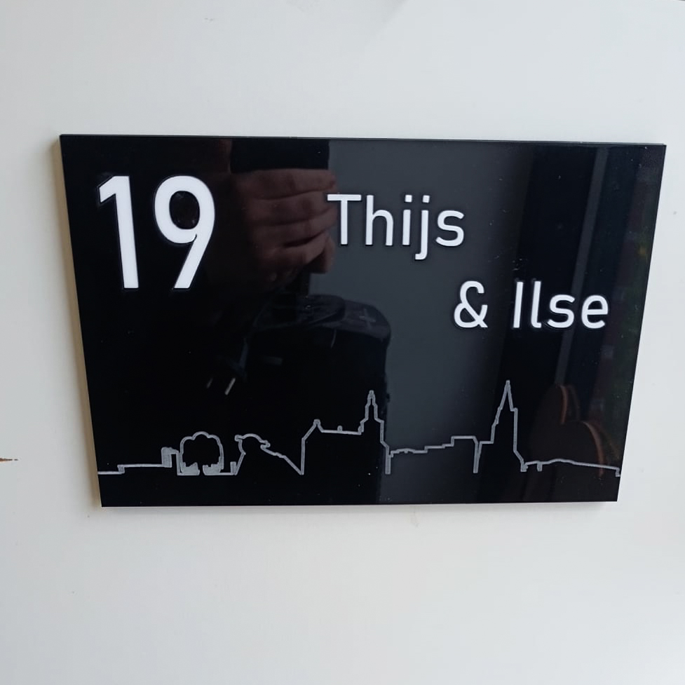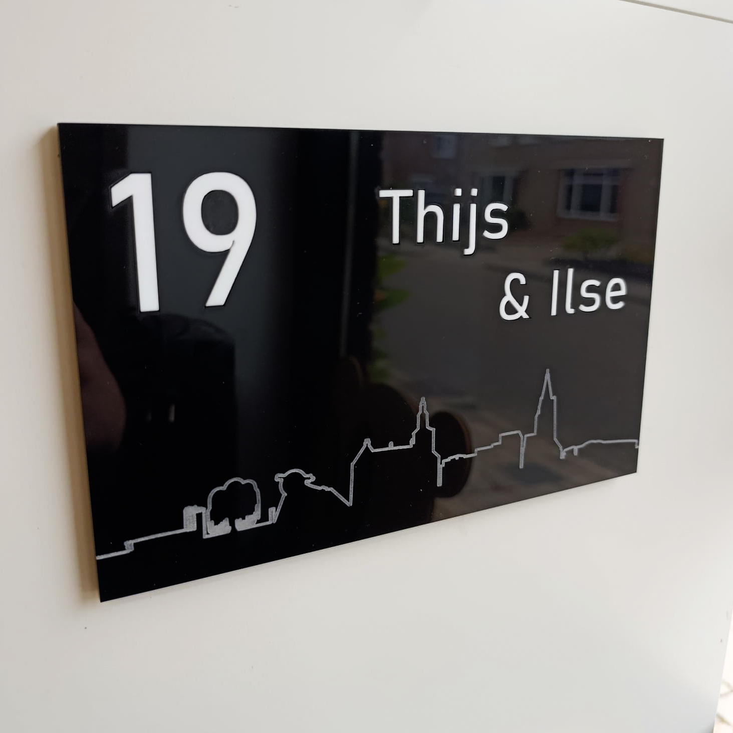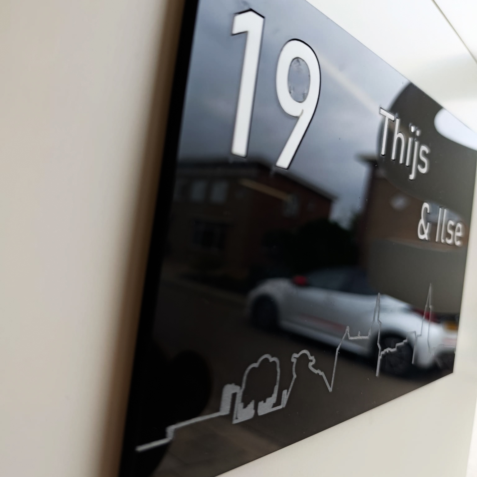 Gemaakt van zwart acrylaat, een stevig en weerbestendig materiaal dat jarenlang mooi blijft. De gravure van de skyline, het huisnummer en de namen is strak wit, wat zorgt voor een modern contrast en uitstekende leesbaarheid.